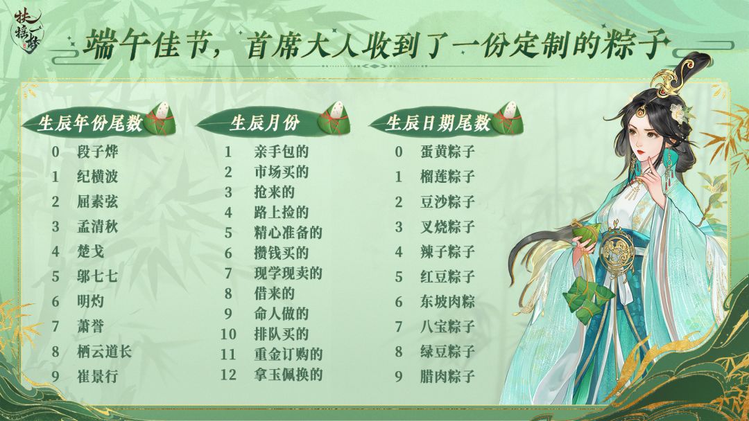 各位首席大人: 仲夏端午,苍龙七宿高悬于正南中天。本灵鸟祝各位首席大人端午安康、喜笑颜开,诸事顺意! 【评论有礼】 端午佳节,首席大人收到了一份定制的粽子。 根据上图,在评论区回复,你在盛都收到的是什么样的粽子,即可参与活动。本鸟会随机抽出5位首席,送上【50元京东卡】,活动时间为6月21日-6月27日。 示例:如果您的生日为1999年3月14日,则你在盛都收到的是“栖云道长抢来的辣子粽子" 以