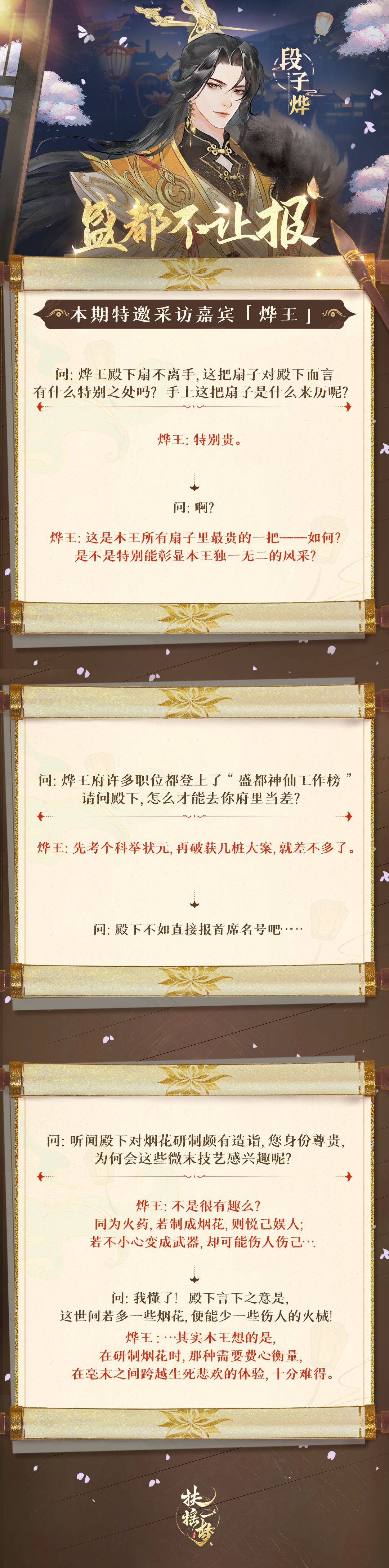 这里是有报天天读,无论风雨或是晴的江湖百晓生——玄凤鸟!啾~ 上次明灼大人的采访一上市秒速售罄,读者们纷纷表示不够看。作为陶然书坊的特别顾问,本鸟提议第二期要乘胜追击,满足盛都街坊们的八卦之心。本期特别邀请了盛都二皇子烨王接受采访,大家不要错过!