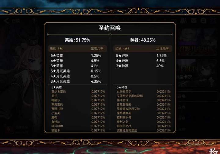如果你是听说福利好入坑的,也别想当然的觉得e7角色好抽,这里提前给你们说明一点:e7三色角色不值钱但依旧稀有。看了我贴的卡池机制和概率,要是觉得不能接受的真不建议入坑,等你吃保底不出货的时候别骂e7垃圾就行。圣约召唤(普池)召唤道具:圣约书签机制:系统每日赠送一次免费召唤机会、不套用保底、角色神器混池综合概率:三色五星英雄1.25%、月光五星英雄0.15%、五星神器1.75%ps.抽普池