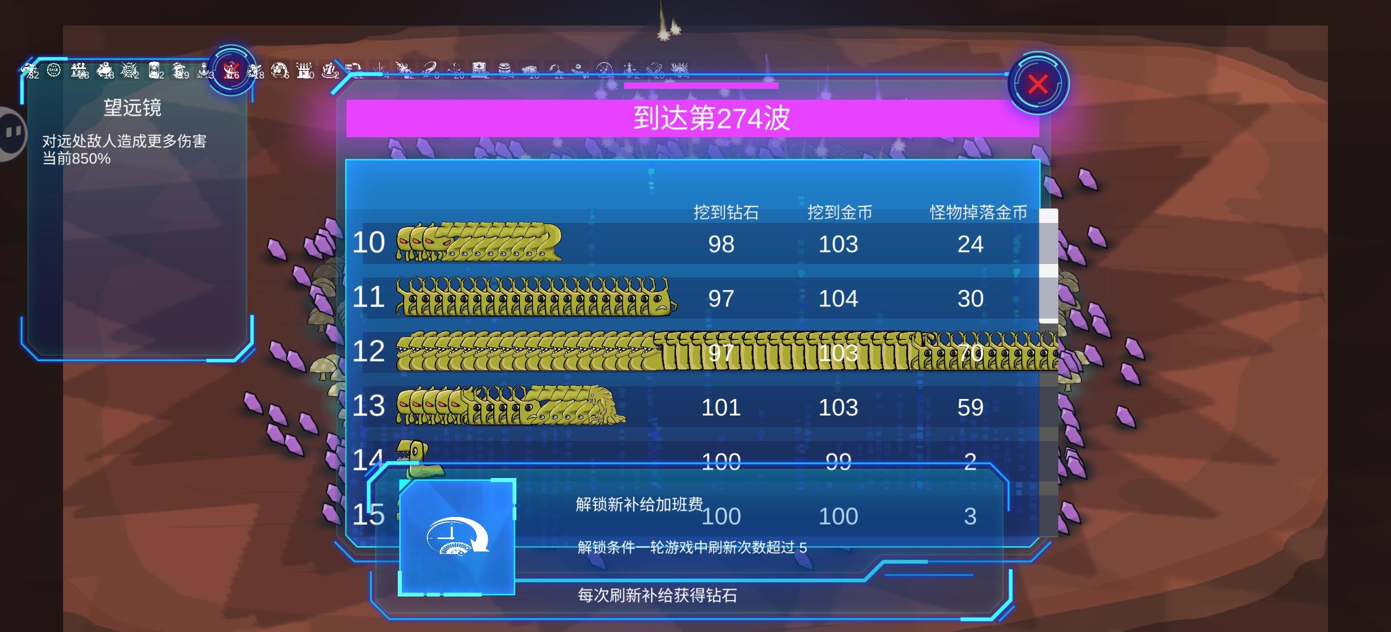 波次没有打到太多,因为实在太卡,怕闪退了,补给我优先选减少补给间隔,和天赋搭配两回合能选两次金补给,另外选加钱的,天赋有个金币增伤也不错,其他buff我认为都随意选了,毕竟两回合就能选两次,任你选。