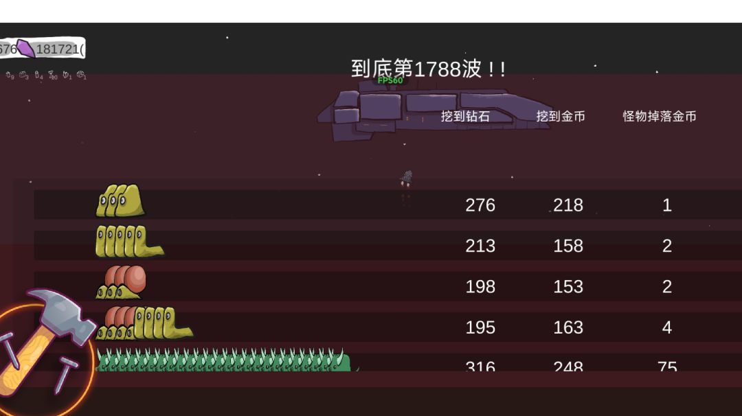 这游戏不用点武器升级,开局怼挖矿机器人,开局支援打一波游荡者(不攻击)之后升级就好了。 第一次转折200钻石,开起无视怪物攻击采矿,然后资源采集点满, 第二次转折,资源采集点满,就无敌了,后面把武器解锁之后,随便打一下刷到两万钻石这游戏就结束了