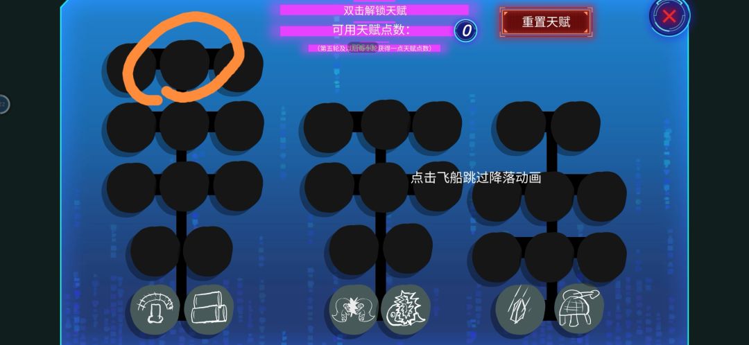 升满2个武器(差不多就能达到45波)45波后图中画圈的天赋可以点,然后重置天赋,再点。反复,点一次1000钻石和当前金币翻倍,然后就不缺金币不缺钻石了
