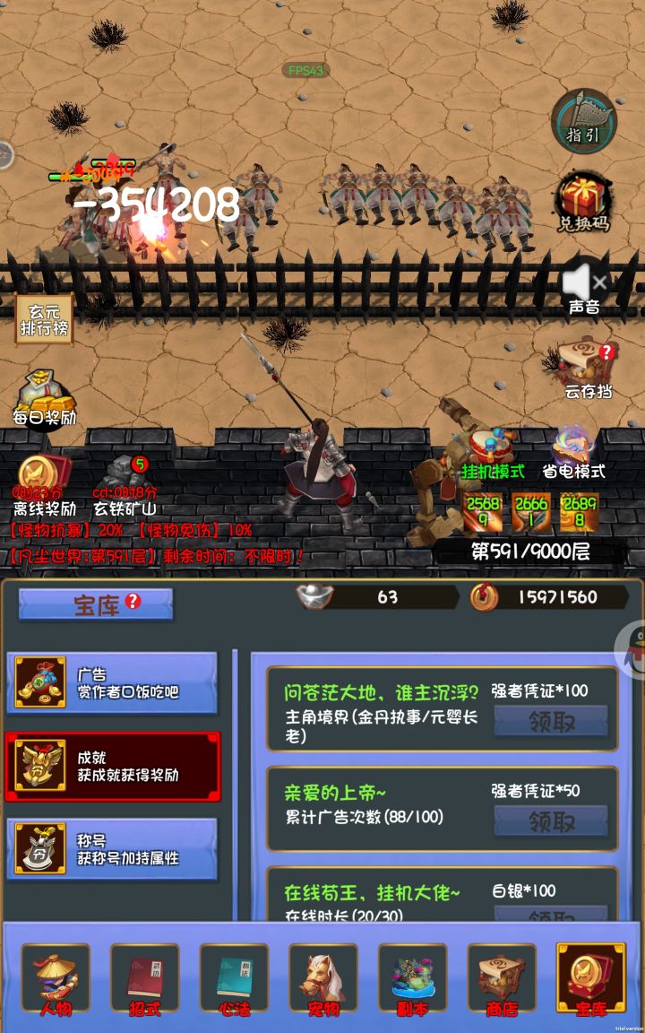 建议前期八卦刀法,直接拉到40级,快速解锁第10关。中间右边有3个buff,可以看广告来有加成。看一次永久加5分钟buff时长,初始为30分钟,加的非常多。