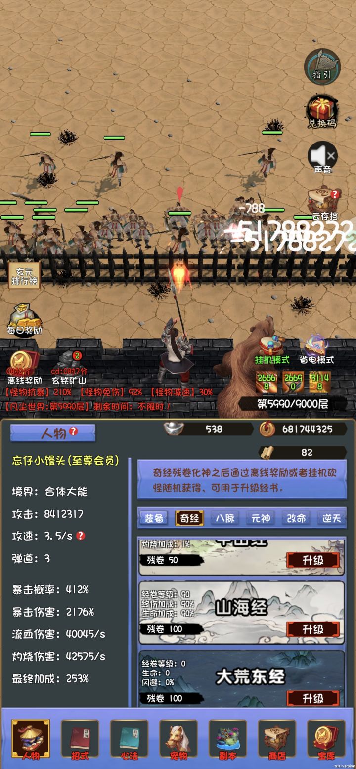6.闯关挂机,保持秒杀或者两刀一个挂机怪的关卡挂机,收益最大化。闯关时怪物血量为挂机怪物血量的两倍(某些怪少的关卡除外)