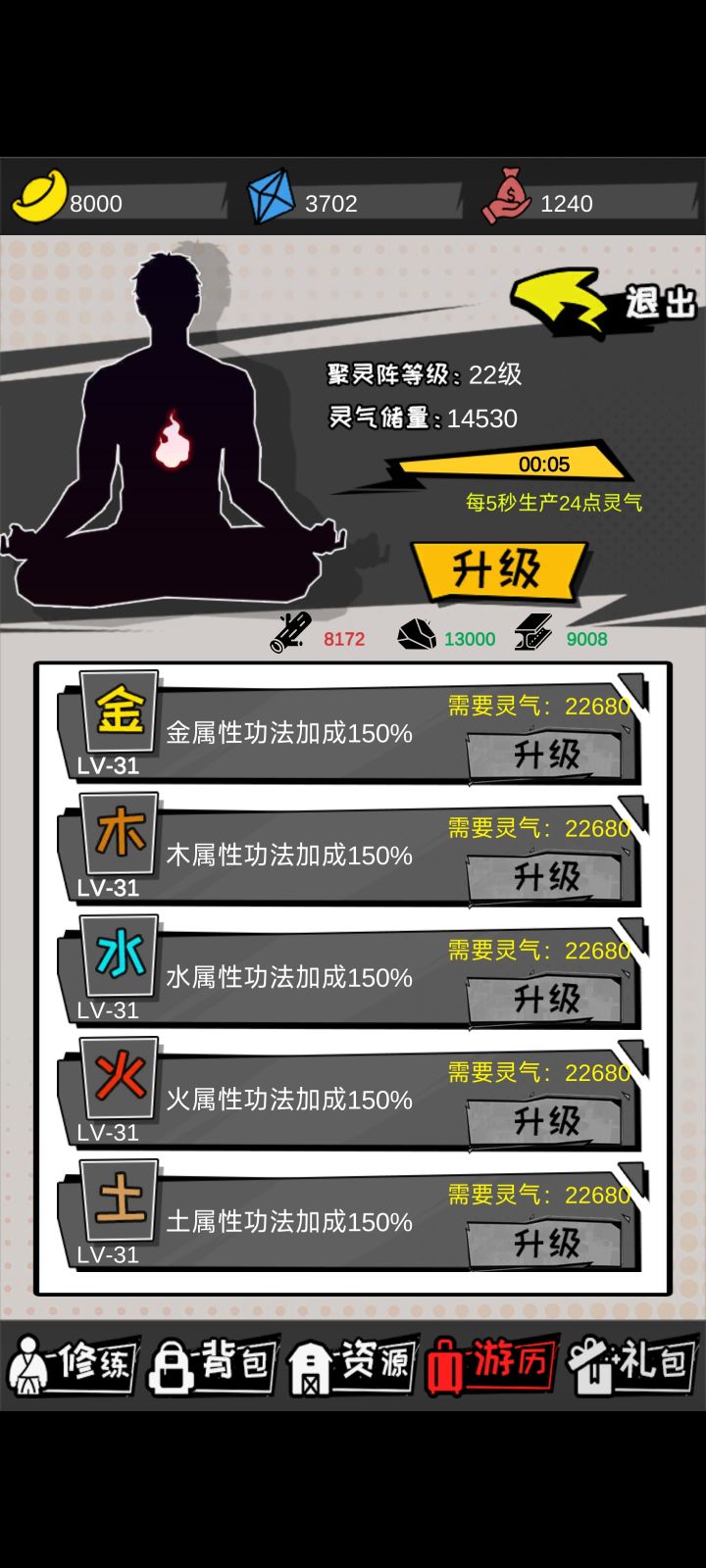养成线比较多,有【境界】【装备】【炼丹】【法功】【宗师】【阵法】等,其中境界即挂机放置,装备和炼丹材料多靠游历副本产出,宗师便理解为抽卡类养成等;