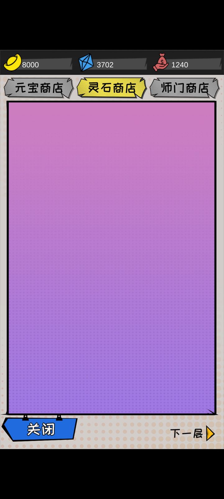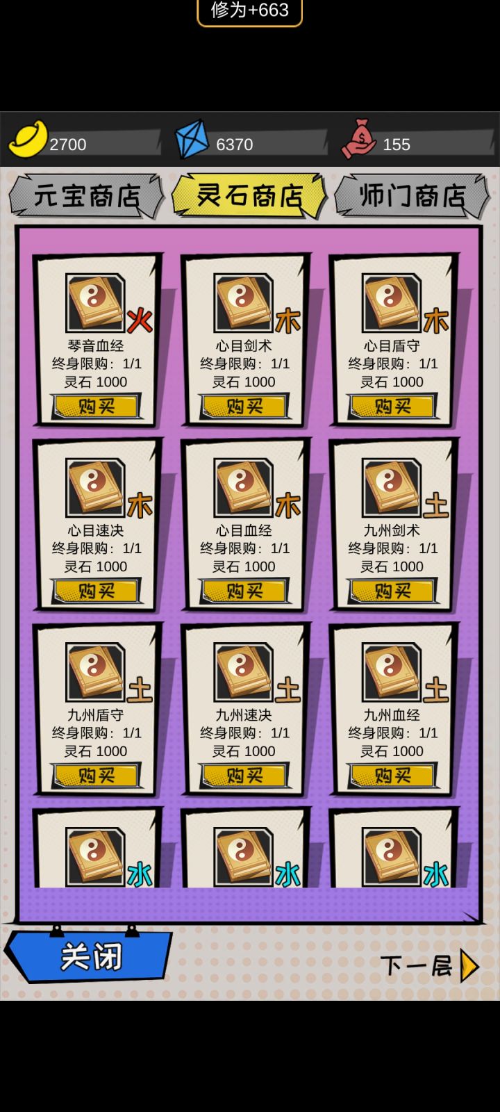 我化神3段,功法加成150%,商店前两层能买的功法都买了,却打不过金丹副本,然后我用元宝买了一套元婴装备才打过,然后元婴副本又打不过卡在第四层