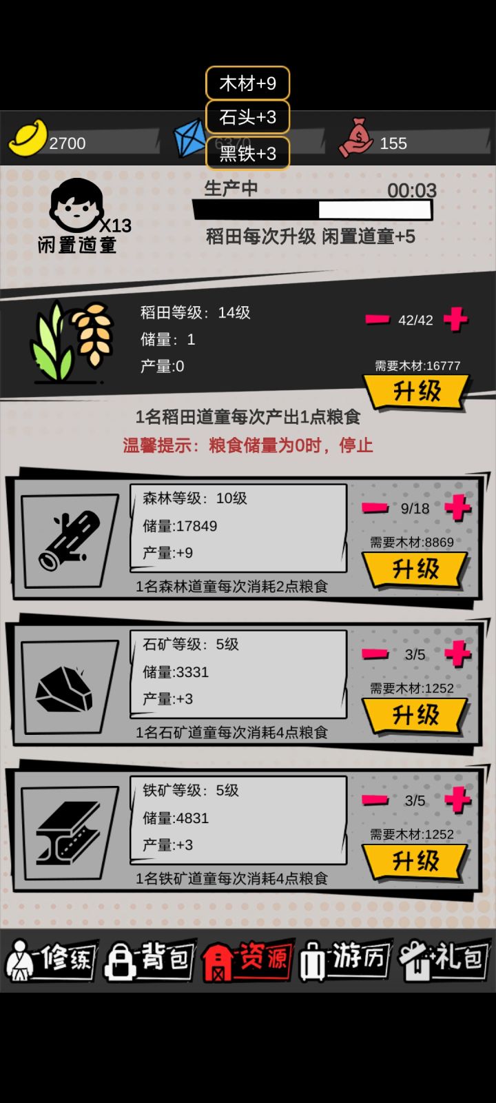 资源那部分,不管怎么样都会有闲置的道童,不然粮食就不够。木材不升级稻田就升不动,稻田升了人就多了,但是稻田里能工作的道童又不多,我不知道制作组有没有自己玩过,感想如何。