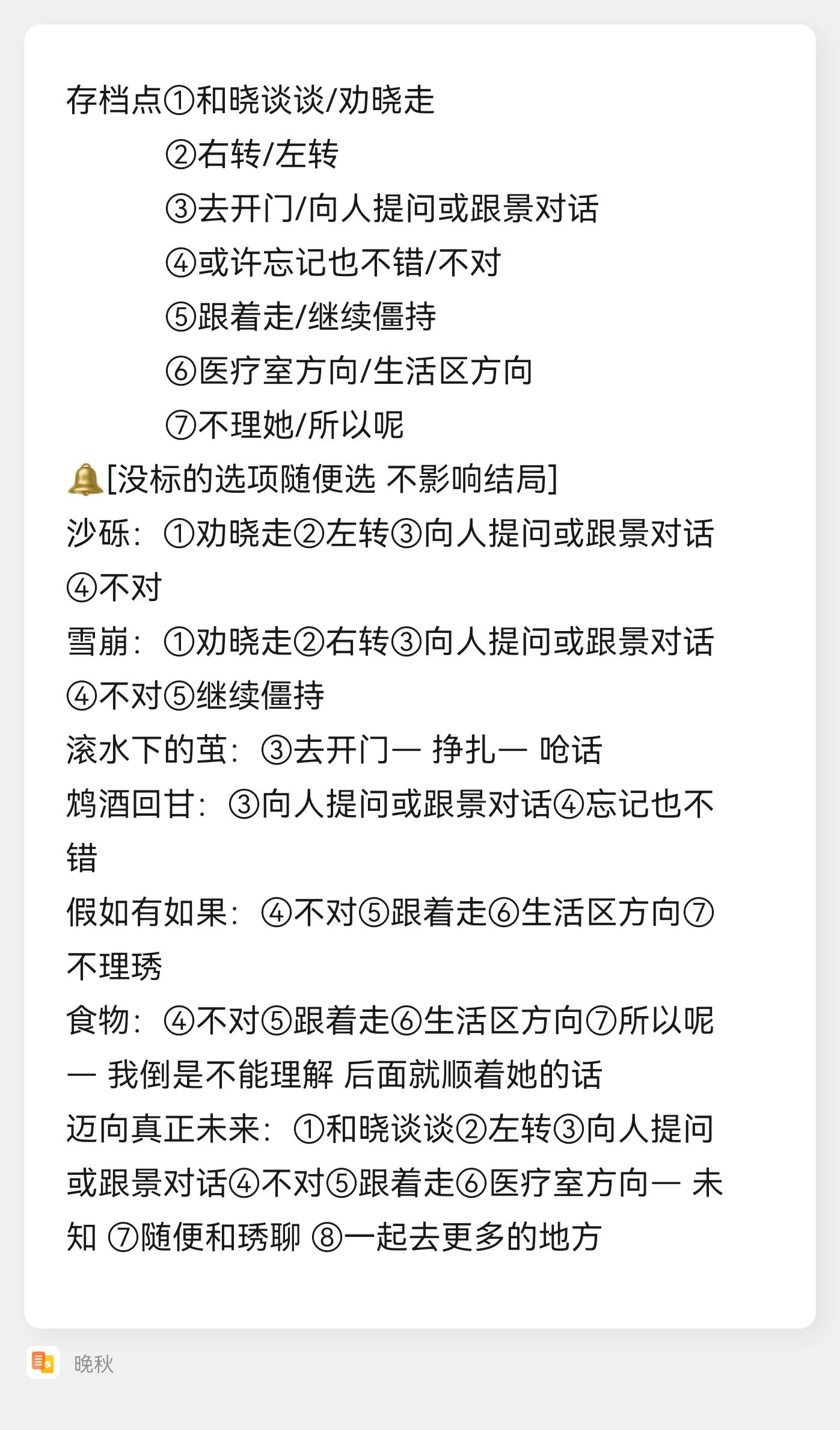 我自己打的发一下吧……主要的就是晓那里,上门给你送苹果,让他进来,这里我记得会影响剧情,不要选劝走他,缘会把晓哥哥弄晕,然后是被绑架车那里,选左边,那个门开的时候选闯出去,去医务室,去未知的房间就可以看见景,冲上去可以亲亲😚后面和教授他老婆谈话有点影响,我选的是所以呢,和我想过是你,后面景要去散步,和他去,不选我不喜欢散步,后面那个拉一下好像没影响,如果后面选是撒娇,不是真的在哭,可以和景亲亲