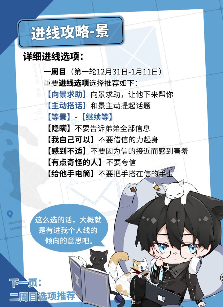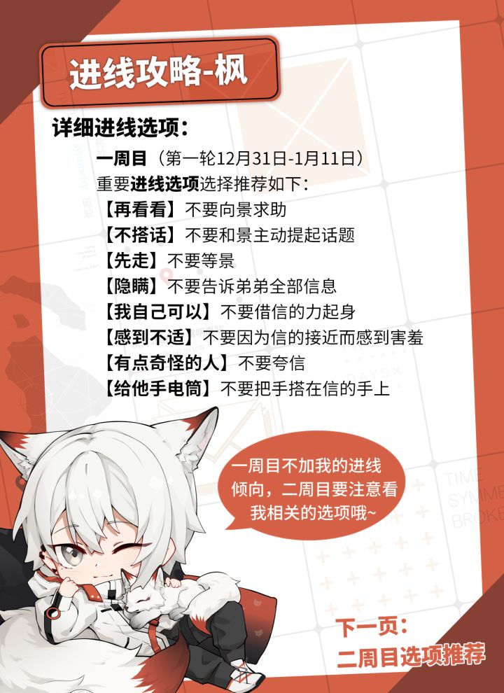 将记忆抽丝剥茧 让枷锁化为武器 当爱与信任被架上天平,你是否还能突破时间的迷局,抓住真相和生机? 循环,要开始了。 CV: 枫——CV斑马 景——CV马正阳 律——CV胡良伟 信——CV姜广涛