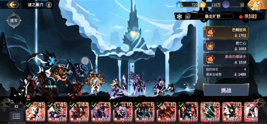 注意:每天的谜之巢穴刷出来的怪是不一样的 阵容:迷之生物放5号位让它到200波的时候暴毙(200波左右大概率刷一个波多尔司机,如图1) 再上一个1级的远程带高级的体力或屏障元核,保证他不会死(因为自爆后没有己方存活的角色,就自动结算了。你自爆炸死的怪就不算你炸死的)且这个1级的远程体型要小于你刷暴躁的角色(上什么远程角色都行,这里推荐上制杖巨人,如图2) 现在阵容里就是:5号位迷之生物+随意位置