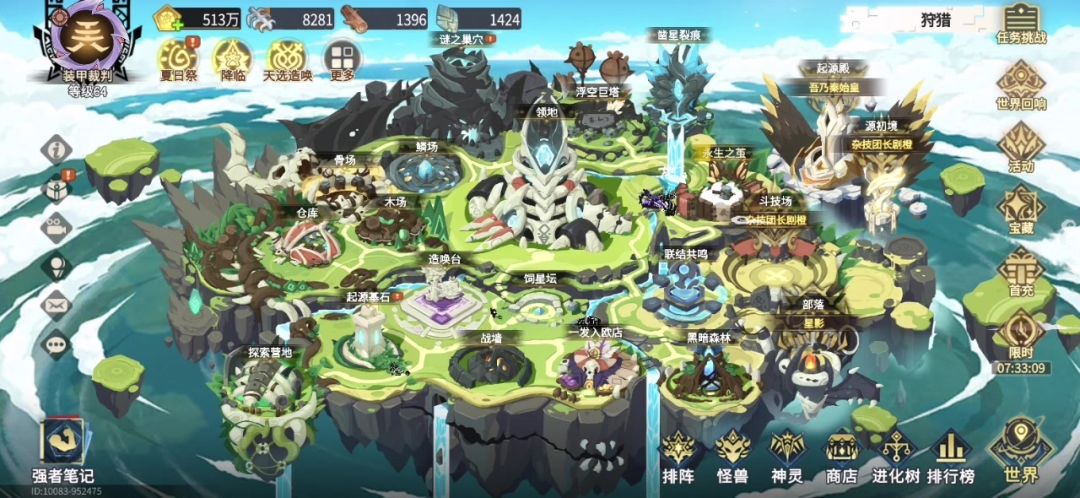 在世界冒险过五关斩六将以后,桐仁拖着疲惫的身躯,“唰”的一下回到自己的领地,在整片超进化大陆美景的拥抱中入睡。 醒来以后,先黑暗森林逛一下,顺路去战墙检查一番,之后再到永生之茧饱餐一顿。 随后开会,将自家怪兽安排得明明白白:你去起源基石,你去饲星坛,你们就去探索营地准备好去探索,你就去谜之巢穴跑10分钟,你呢就好好休息整备!你就去斗技场好好锻炼!剩下的去凿星裂痕探索ψ(`∇´)ψ 而它自然是要去造