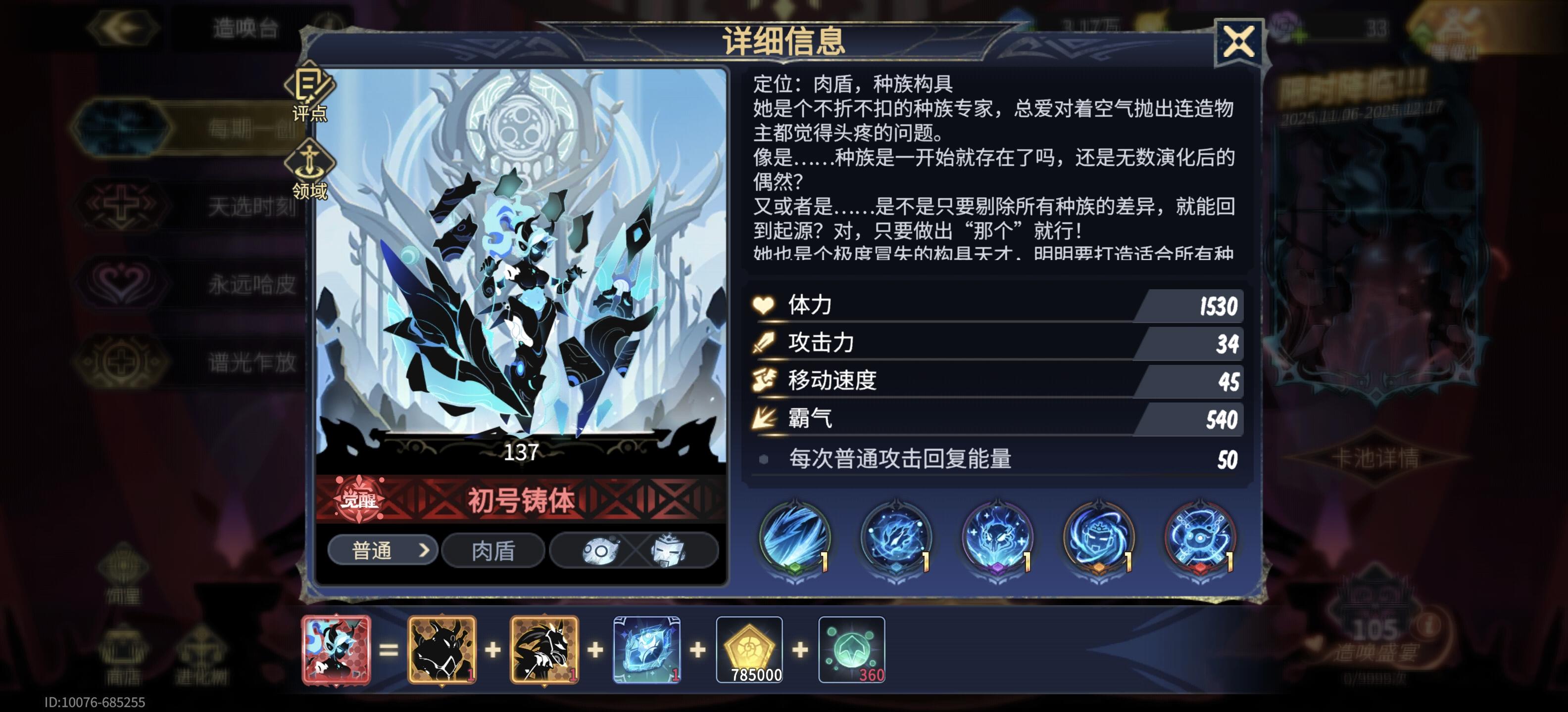 作者 tap:迪奥·布兰度 b站:柚子彦皮 游戏名:卷戒逆溟魂 ————————————————————————— ——元核配置—— 攻击或体力核 小词条:起源之魂/魄、破甲之力、增益极化、极致元核、攻击、体力。 宿命词条:暴怒、无损、重生、终结、祝福、野性 ——基因选择—— 小基因全120体-10攻 大基因360体或120攻(因为本身基础射程极高,所以可以不需要点射程) ——极化技能—— 能量破