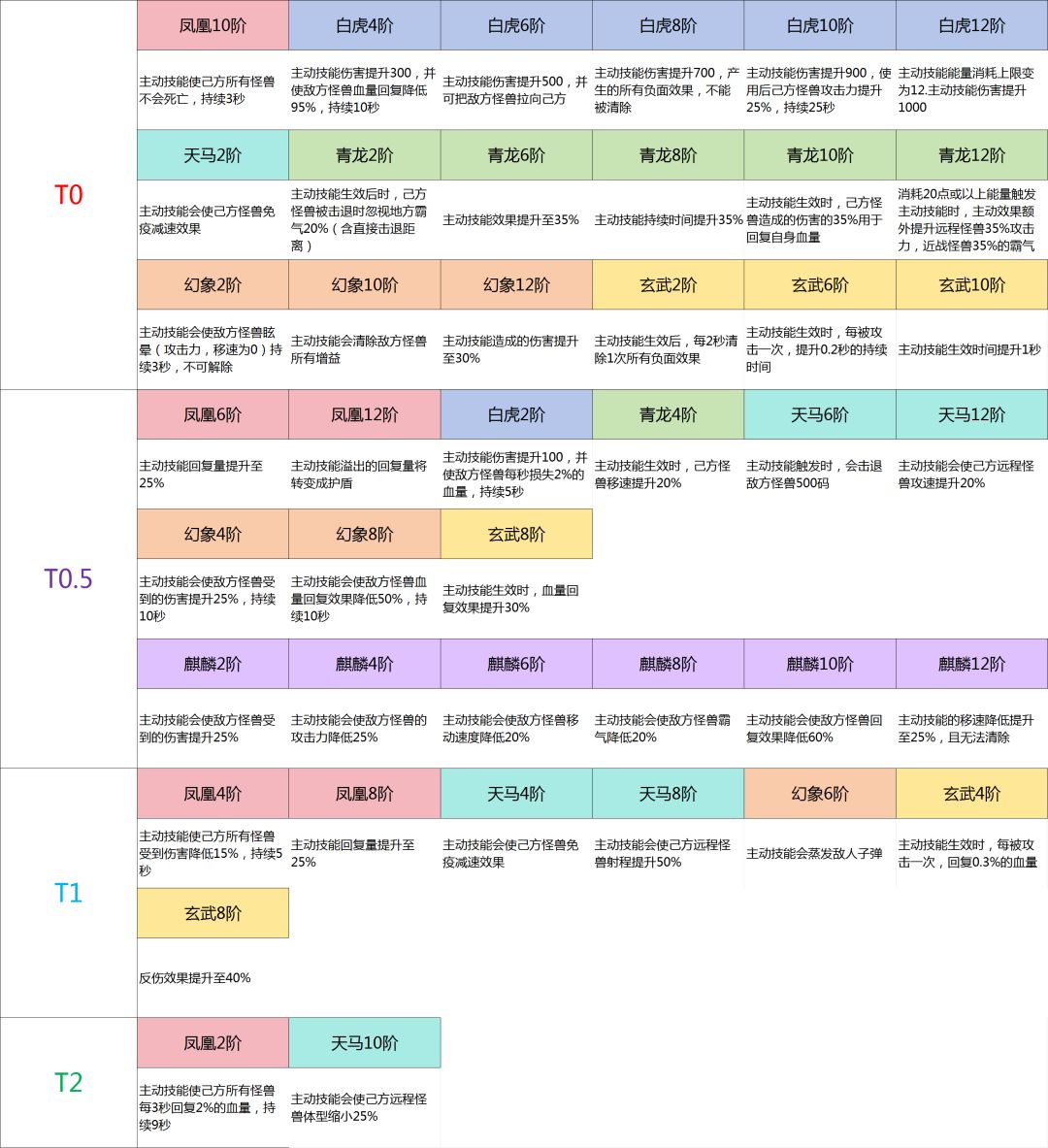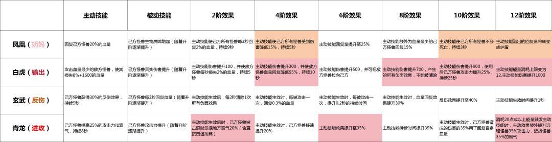 【凤凰】质变阶段 4阶效果:主动技能使己方所有怪兽受到伤害降低15%,持续5秒 10阶效果:主动技能使己方所有怪兽不会死亡,持续3秒 12阶效果:主动技能溢出的回复量将转变成护盾 【白虎】质变阶段 4阶效果:主动技能伤害提升300,并使敌方怪兽血量回复降低95%,持续10秒 8阶效果:主动技能伤害提升700,产生的所有负面效果,不能被清除 10阶效果:主动技能伤害提升900,使用后己方怪兽攻击力提