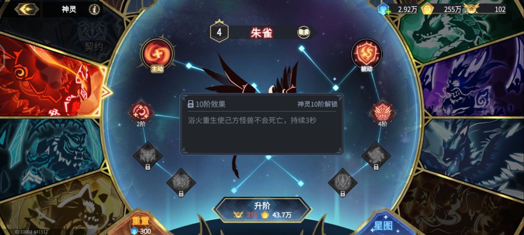 首先看看各个神灵的关键技能 朱雀10级能免死,但是10级所需的资源太多了,所以先不考虑升10级,2级或以上就行。 白虎4级禁疗,6级拉人都是很有用的,而且所需资源没那么多,所以建议白虎升到4级或者6级。 玄武2级清debuff非常好用,所以2级就够了。 青龙2级小稳固,10级近战回血,但是10级现在搞不起,所以建议青龙升到2级。 麒麟封技能的是本身效果,升级不过是多给点负面效果,建议2级或以上 天