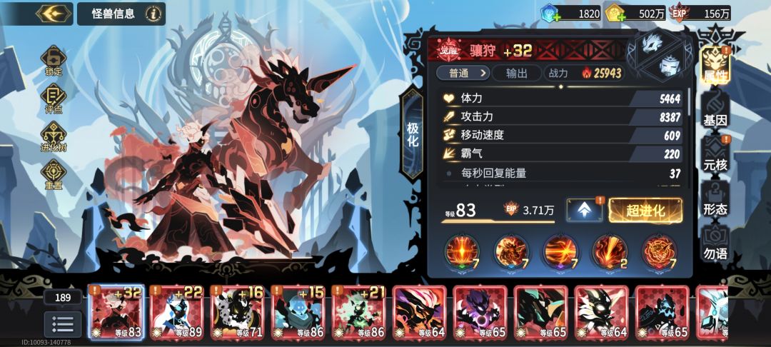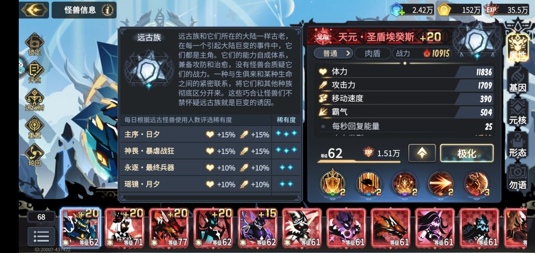 阵容组成:腾龙 御空 气奥 日主 漆黑 元核选择 腾龙:体力 铁壁/霸王/圣洁 御空:体力 霸王 气奥:生物屏障 重生 日主/漆黑:攻击 野性/终结 基因选择 腾龙:小基因体力120,大基因保持面板速度在200左右,体型在850左右的情况下全点体力 御空:小基因120体力,大基因100霸气 气奥:大先基因全部点生物屏障 日主:小基因120体力,大基因保证射程在1300左右剩余全点体力 漆黑:小基因