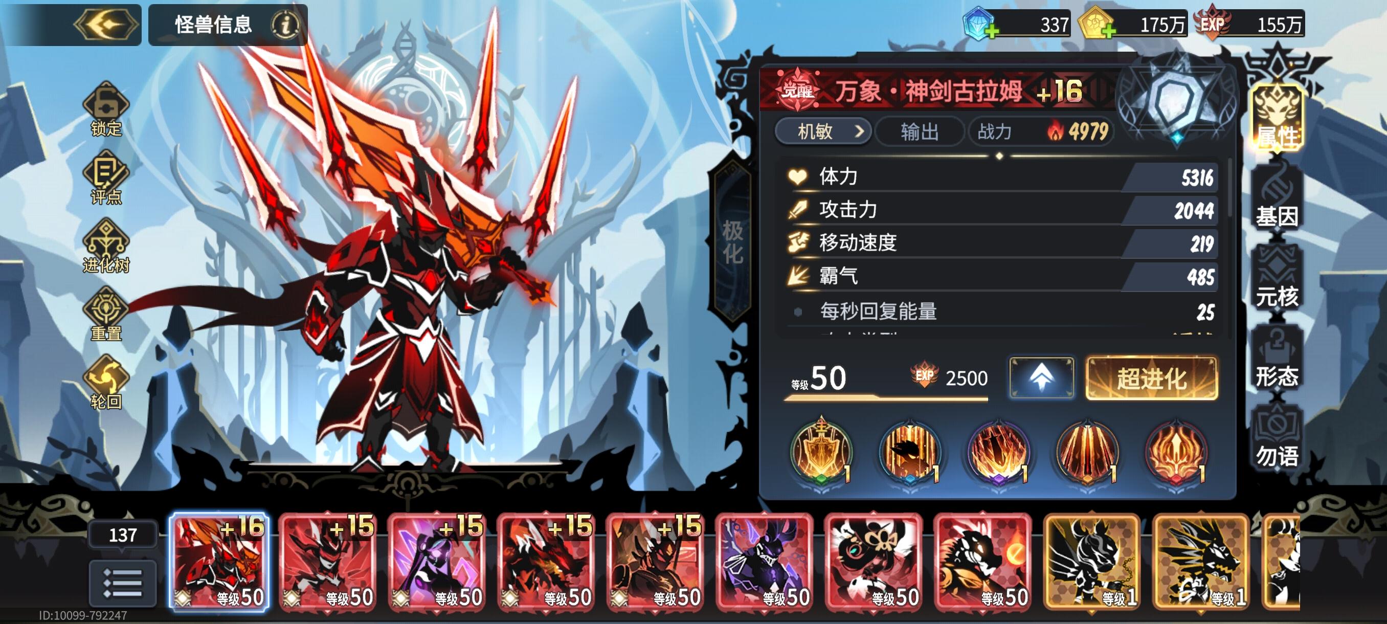 思路:由于版本盾月比较强势,无敌剑主纷纷抛弃魅妆,选择了崩祁组合,同时斧子为了对抗盾月也纷纷选择了肉斧,在这个畸形的版本里,兵器的两大天敌已经不足为俱了。兵器作为超2第一范围输出,足够秒杀盾主和月主。【兵器】速度:1200性格:暴躁极化:爆裂、破则、屠戮、影子基因:大基因点速度和攻击或者体力,保证比崩高即可。原核:攻击、体力、极致、负面、破甲。超进化:护盾【荆】速度:1400性