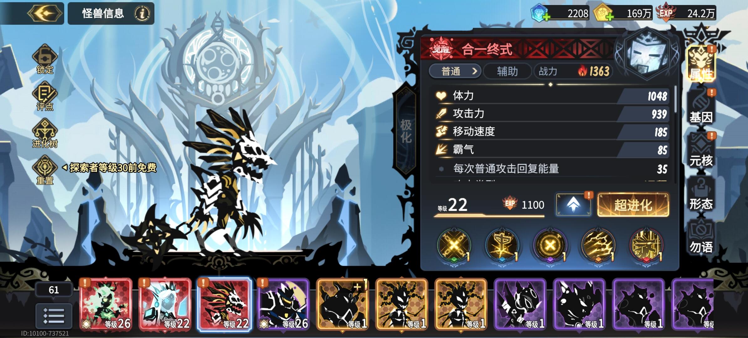 思路:由于版本盾月比较强势,无敌剑主纷纷抛弃魅妆,选择了崩祁组合,同时斧子为了对抗盾月也纷纷选择了肉斧,在这个畸形的版本里,兵器的两大天敌已经不足为俱了。兵器作为超2第一范围输出,足够秒杀盾主和月主。【兵器】速度:1200性格:暴躁极化:爆裂、破则、屠戮、影子基因:大基因点速度和攻击或者体力,保证比崩高即可。原核:攻击、体力、极致、负面、破甲。超进化:护盾【荆】速度:1400性