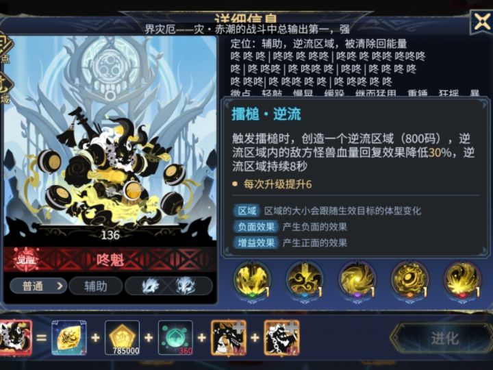 远程攻速0.6普攻间隔2.1秒一技能超大范围330倍率缺点只在场地中央,强压队伍已经看出来了,和你的队伍没有任何关系二技能满增益6秒可减普攻命中目标增益时长且高贵的恒定击退,会存在3秒增益空档情况(该状态可清除,幻的含金量还在上涨)三四五技能都是基于二技能状态的加强和保命基因90体加60射程其余体力性格加攻就行即可元核体力/攻击词条2增益1破甲其余特攻(体力核可极致)可选择性上减负宿