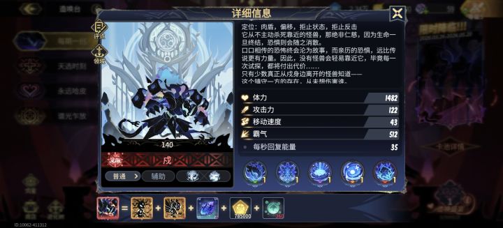 先分析一下技能,一技能3秒后可释放(要求带无损开局不然没坦度直接像艾一样暴毙)一技能触发以后10秒常驻7000坚韧坦度比较客观且不担心减时长不怕清除,在我方半场自带稳固(防强压)面板固定50移速嗯白嫖20移速血赚(不吃天马加成无论在哪边半场,你问我咋知道我刚从巢穴刷毅力出来)二技能缝合荆55弹伤成长值一看就被砍了不然应该是66,技能不会打死人但能压没日月队伍的生存状态三技能是二个核心一技能后