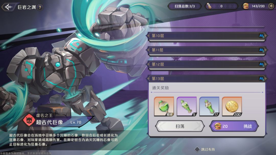 巨岩之渊副本是《纳萨力克之王》中获取角色经验道具的最主要来源之一,需要每天固定刷取从而提升角色等级。相较于其他副本而言,巨岩之渊的机制相对简单,通关难度也比较低。下面就为大家带来巨岩之渊的通关攻略和配队思路介绍。 目录 一、 巨岩之渊简介 二、 boss打法攻略 (一) 技能介绍 (二) 阵容推荐 (三) 通关技巧 巨岩之渊简介 巨岩之渊只有1种类型的boss——超古代巨像,副本分为13层,每层难