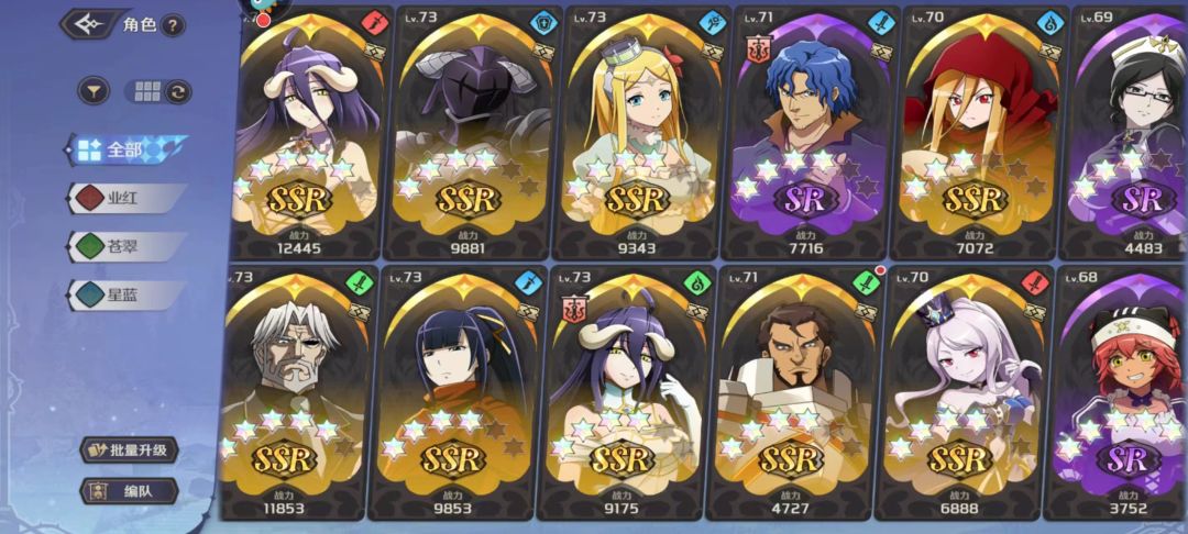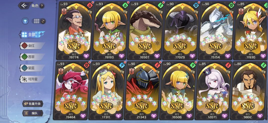两个多月前的版本. 貌似还适用. SSR大部份5-6星. 五星基本就差派遣半个月肝剩下的升6. 或者等歪.. 战夏盾夏盾雅等 都歪满了很多个.. 五个大不留氪度. 新出部分6+6. 不是开服玩家. 没爱雅. 活动基本全拿满 打满. pvp 各种越级. 应该有点资格扯两句吧. 顺便吐槽一下 氪金点贼多. 缺啥材料 弹个礼包出来 让你不再为资源发愁[表情_狗头] 游戏其实还算可以. 就是运营真
