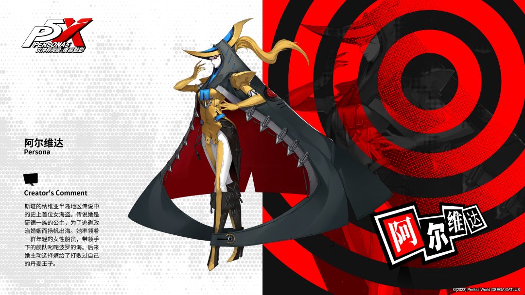 >>>PERSONA! 『阿尔维达』介绍 斯堪的纳维亚半岛地区传说中的史上首位女海盗。 传说她是哥德一族的公主,为了逃避政治婚姻而扬帆出海。 她率领着一群年轻的女性船员,带领手下的舰队叱咤波罗的海。 后来她主动选择嫁给了打败过自己的丹麦王子。 ————收下你的心!———— //《女神异闻录:夜幕魅影》预约正在进行中! >>>前往预约: 【其他活动福利】: 官方微信:女神异闻录夜幕魅影 官方①群: 官