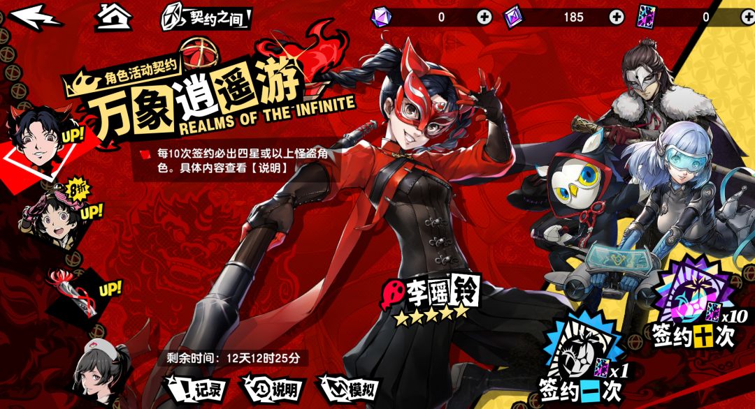 💪限定角色:🎭5★限时UP怪盗「李瑶玲(代号 RIN)」——定位:(屈从│诅咒) 🎉怪盗简介 大学一年级的少女,出生于中国四川,作为留学生来到日本。 性格开朗大方,是一个言行跳脱的乐天派,有时也会露出孩子气的一面。 因为迟迟找不到人生目标而陷入焦躁不安,正在各种新鲜体验中积极寻找答案。 代号是『RIN』。 初始人格面具Ⅱ是『孟婆』。 🎉角色评测 「李瑶玲(代号 RIN)」P5X主角团角色 属性:诅