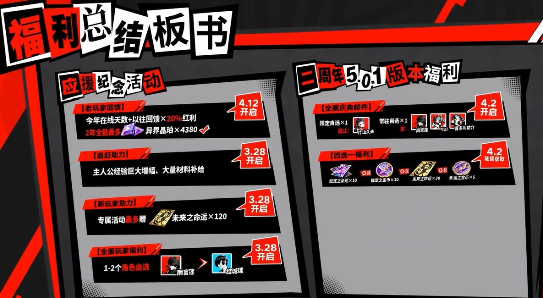#P5X创作征集令 虽然知道P5X一直以来都很大方,自选5星自选专武都能白嫖,每每小节或者版本更新,运营、活动、玩法等都能拿到不少奖励,但说真的,P5X这版本不垫40抽的朋友们真的血亏呀!不信的话,就接着往下看! 这次,游戏更新1.3.2版本后,一下子上线了李瑶玲和西森阳菜的池子(独立的卡池),并且两个卡池的前2次十连都只要八折,这一看是不是良心多了。哎~等等,还有呢!这次的两个卡池还共享保底次