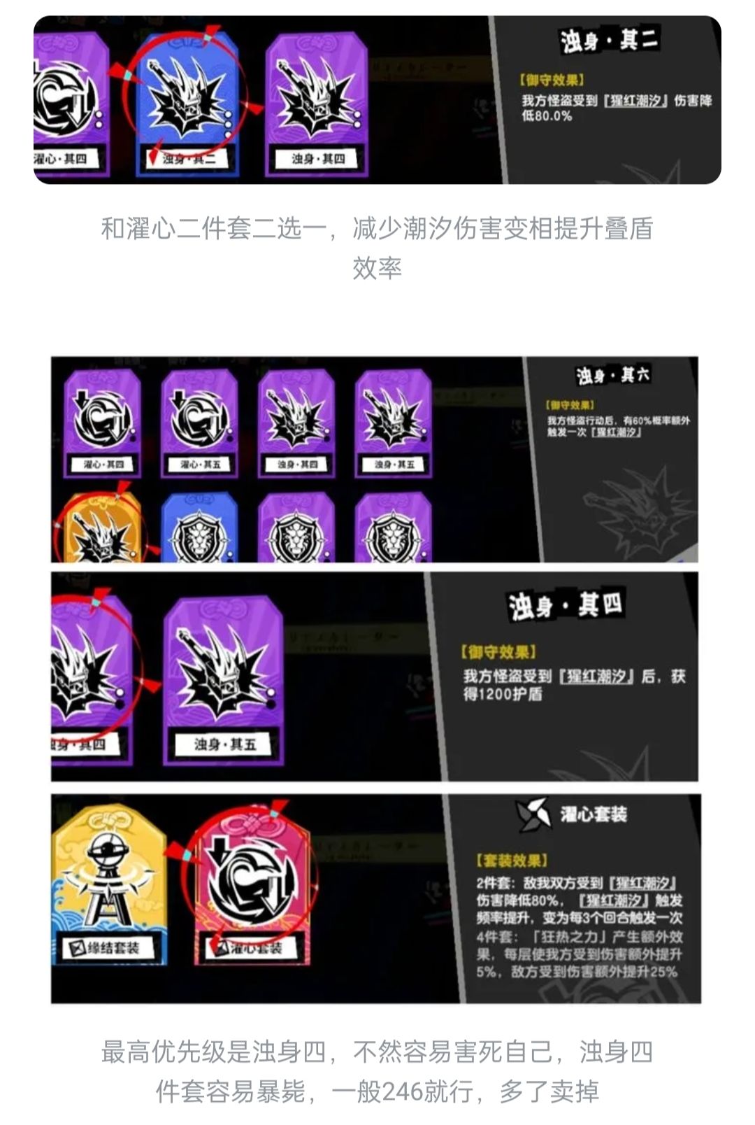核心是这四个: 一般凑齐上面四个,一回合可以叠上万的盾,基本死不了(除了被浊身四件套害死[表情_吃瓜])。 濯心套装推荐如下四个,进一步提升潮汐收益: 由于这个套路提供了减少解明CD的功能(濯心四)和大量护盾, 如果还想进一步提升,可以往结缘套和加护套上靠: 总得来说,浊身叠盾是一种成型快且强度高的活动玩法,很建议大家试试。 我过难度六的时候主角才55级,这个活动真没传的那么难。主要思路就是选烛身