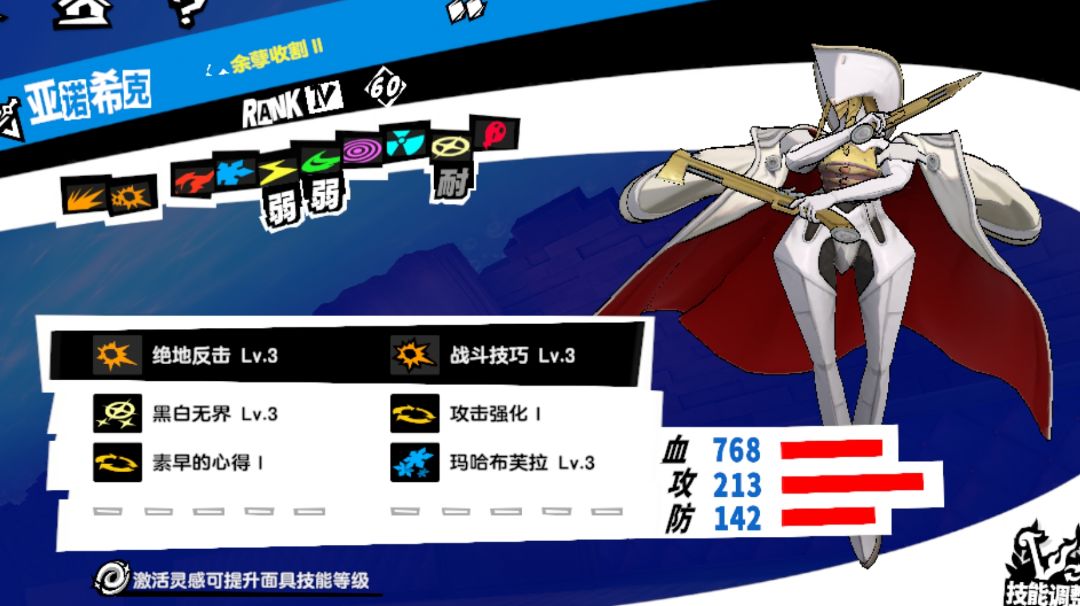 如图 亚诺希克:射击,祝福,冰 地狱天使:火,疾风,核热 白骑士:诅咒,电,念动 属性值优秀的人格面具和几乎涵盖所有属性的群攻能应对绝大部分场面,除了机制怪永远可以打出weak 让人格面具获得其他面具技能的方法:进入育成页面,左上筛选自己想要的技能,投喂对应的人格面具印记,会习得投喂的印记的一个技能,反复直到喂出自己想要的那个技能#攻略