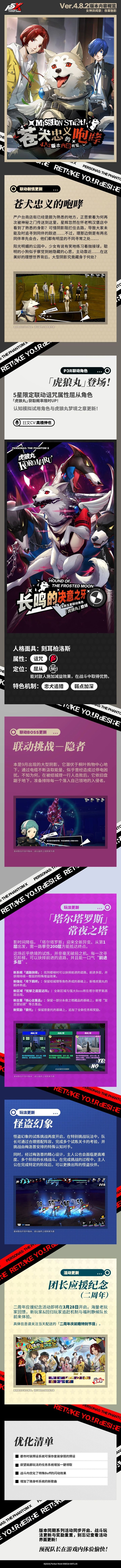 《女神异闻录:夜幕魅影》Ver.4.8.2版本“苍犬忠义的咆哮”正式上线,同步开启与《女神异闻录3》的联动活动,推出限定角色虎狼丸及全新玩法与挑战。 本次版本为《女神异闻录:夜幕魅影》与《女神异闻录3》的联动版本,推出5星限定诅咒属性屈从角色虎狼丸,其获取概率限时UP,同时更新认知模拟试用角色与虎狼丸梦境之章。版本新增联动BOSS隐者,玩家可挑战这一大型阴影;同时开放全新玩法塔尔塔罗斯 常夜之