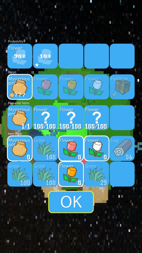 以前一直觉得罐子是用来合成的,用各种不同的东西合成不一样的物品的,第一次用低廉的草合成的花,让我觉得这是很强大的罐子,然而事实,,,用更好的东西结果概率还比草的低那么问题来了除了蘑菇是种了树以后得来的,花都是罐子得来的,那么剩余这么多个格子是什么呢????