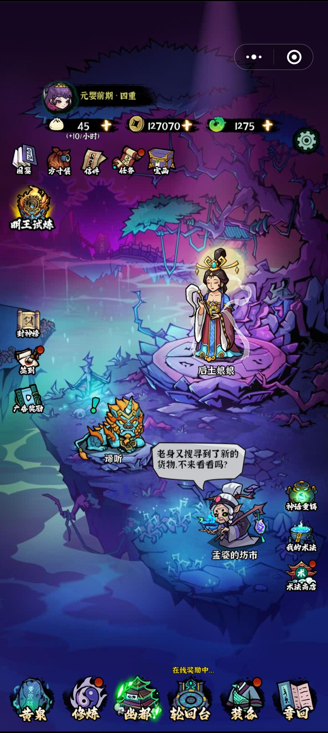 一.谛听版本,6月9号以后貌似就再也没有更新。(这个版本我也肝了快半个月了[表情_捂脸哭]) 此版本较多,官群内好像也只到这个版本,微信小程序也多次主体变更没有更新。 轮回台在界面下方,装备界面只有一键合成和一键装备,主界面有谛听,术法需要购买和使用孟婆汤遗忘,每日玉可以领15次等等。【图1&图2】 这个是大部分玩家玩到的版本,就不过多赘述了。 例如:微信小程序«地府传说»,各类APP和TapTa