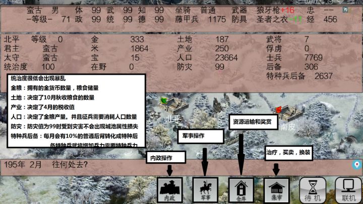 手中三国延续了霸王的大陆中的指令系统,但也有稍许改进。下图是主界面指令系统:选择内政以后,可以使用城镇指令:在主界面选择军事以后则可以执行军队指令:在主界面选择仓库以后可以执行相应的资源指令:在主界面选择集市则可以执行相应的集市指令:在军队中执行出征命令以后系统进行战场操作界面:在大战场中可以使用计策:在大战场中两只部队相邻里可以进攻对方从而进行小战场界面:小