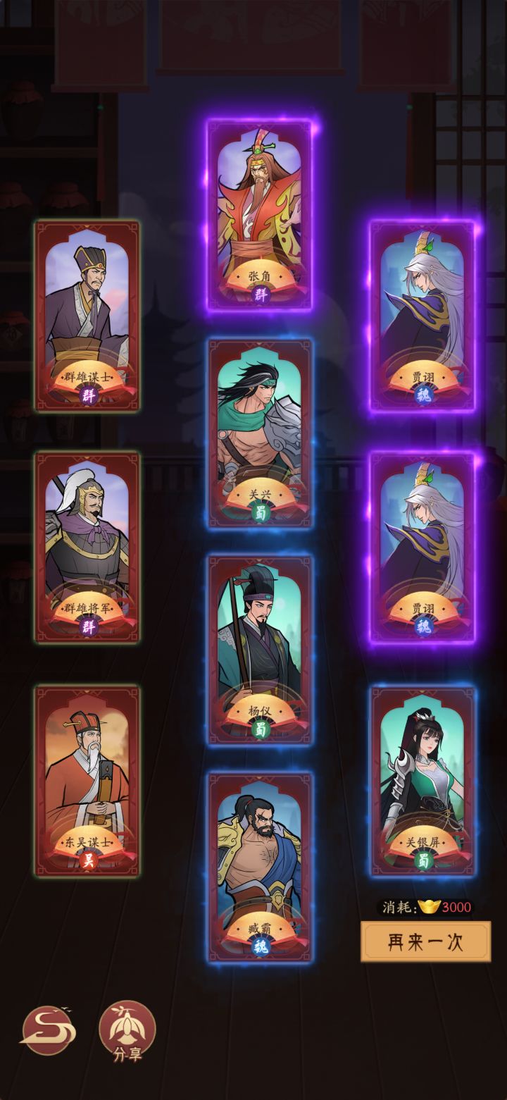 设置了贾诩,一次抽了俩,第一次抽到一样的紫色武将