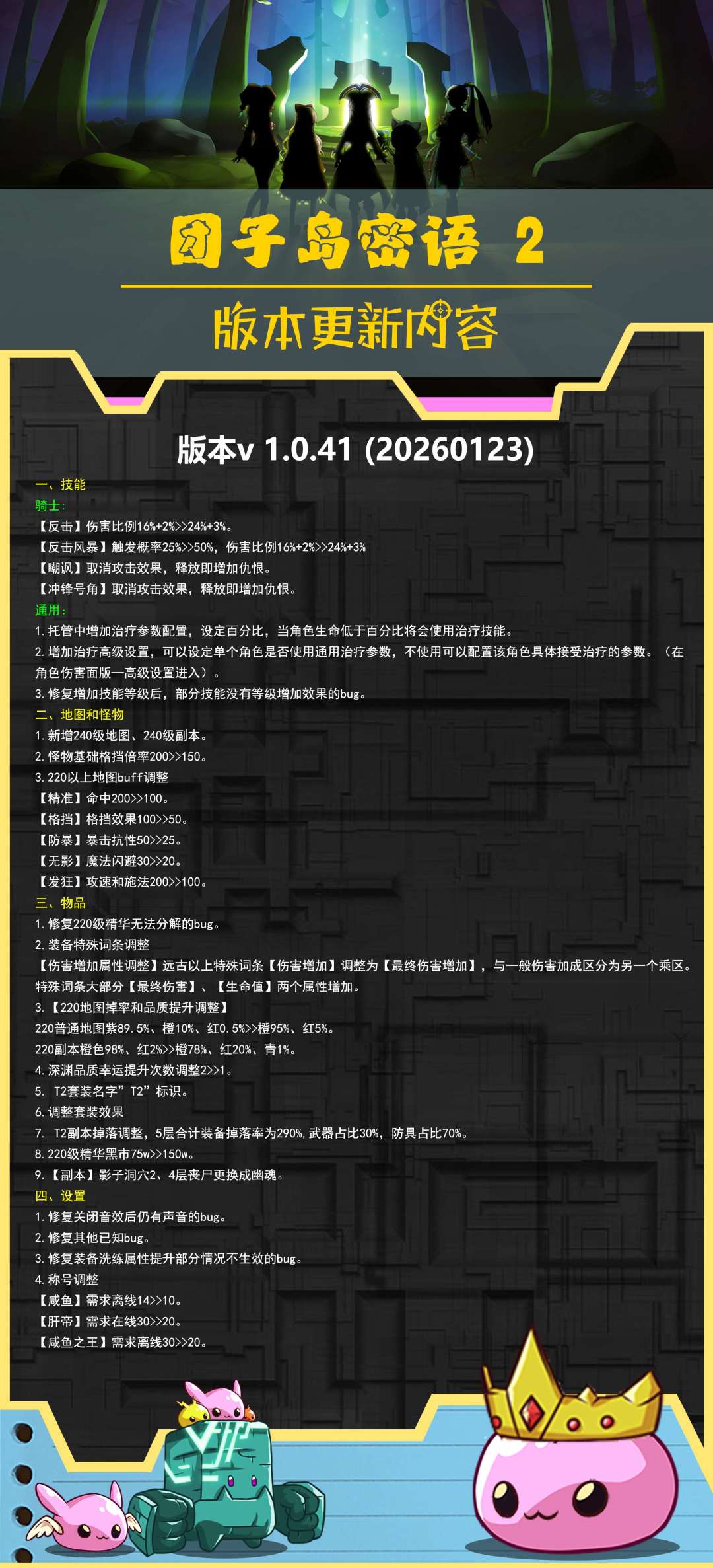 V1.23版(vc23)游戏内容更新: 1.新增11个地图,怪物会掉落神秘熔炼液,可用于离线挂机。 2.参数调整 参数调整攻击力上限调整为50000 暴击倍率上限调整为2500 提升力量攻击成长,增加力量增加破甲值属性 3.成就 地图开拓者2星50下调至40,3星80下调至60 打造大师2星下调至800,3星下调至2000 怪物猎人3星下调至500000