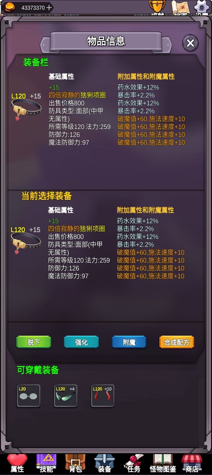 刚通关的地狱难度,就简单说下精华主手武器-石翼+15 攻击896-1120 附魔属性:属性攻击(看属性克制表)*1,巨锤兽人精华*1,禁锢团子精华*1,霜雪巨剑精华*1。副手武器-黑暗战刃+15 攻击560-784 附魔属性:兽人狱兵精华*2,魔甲神团精华*2。头盔-朱雀战神盔+0 附魔属性:圣诞狐精华*4。眼镜-猞猁项圈+0 附魔属性:暗黑花怪精华*4护腕-猫猫手套+12 附魔属性:万