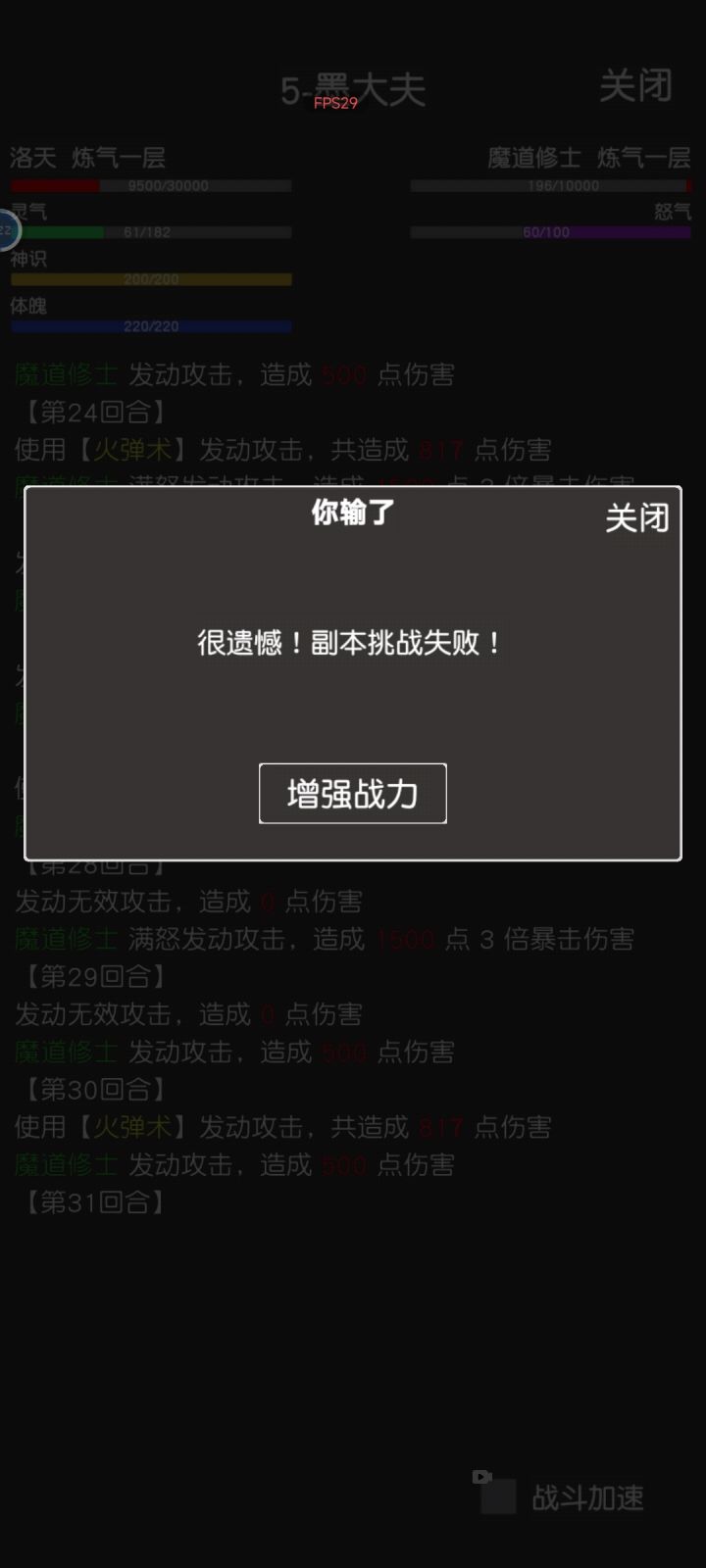 必须1星,先不说战斗过程很长,竟然不能加速,也不是不能加速,可以看- 个广 告加速五分钟。五分钟有多大作用呢,基本就是打两个怪就用完了。战斗过程不能跳过,必须看完,中途退出算失败。炼制丹药过程也很缓慢,不能退出,退出炼制过程会暂停。打怪应该是有回合限制,为什么说应该有呢,因为有时候你看战斗过程明显能看出来我们掉血比怪物掉血慢,绝对能打过,结果等了一两分钟的无聊战斗过程以后,突然给你- -个战