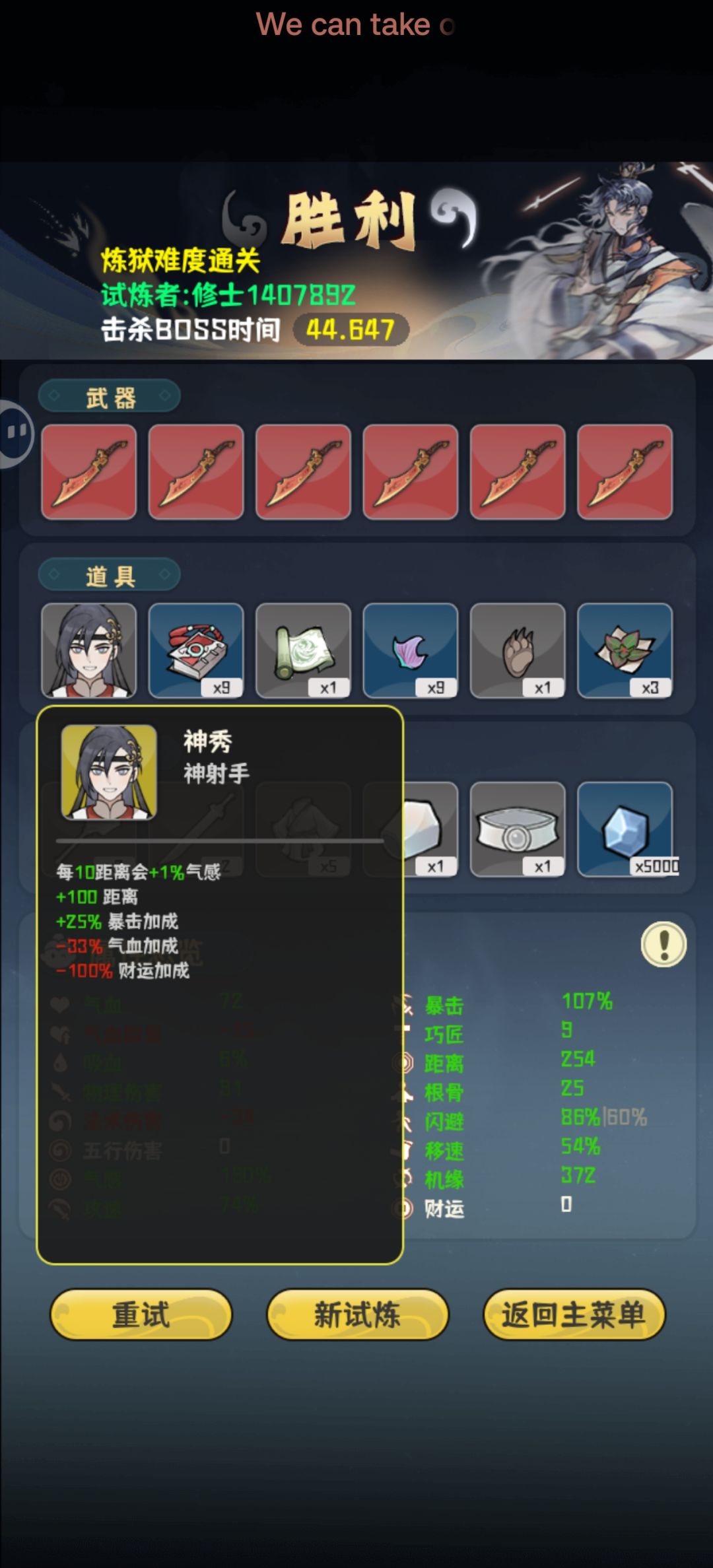 先科普 一下常识,也欢迎各位大佬指正和补充~ 1、界面左上角会显示人头和宝箱,分别代表升级数以及获得宝箱数。 2、游戏最重要的属性是闪避和根骨,活下来才能通关。其中闪避60就满了,如果没有转换数值的道具就不要多叠。 3、10级前同颜色加点财运优先,10级后根骨、闪避、气感、机缘优先,机缘叠到100以上就可以停。 4、法修的攻速很重要,前期可以存钱攒机缘,刷出剑匣就起飞。 5、别问小师妹怎么没有通关