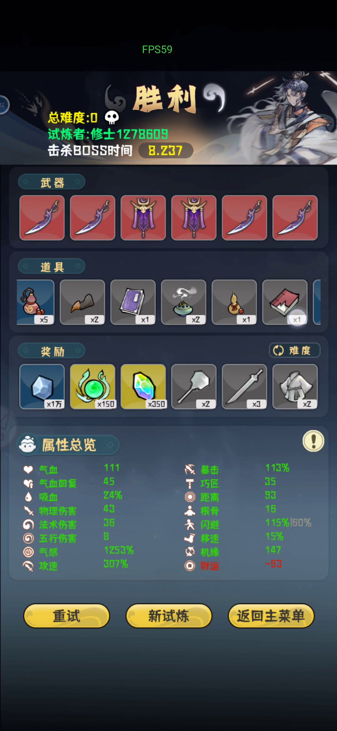 先科普 一下常识,也欢迎各位大佬指正和补充~ 1、界面左上角会显示人头和宝箱,分别代表升级数以及获得宝箱数。 2、游戏最重要的属性是闪避和根骨,活下来才能通关。其中闪避60就满了,如果没有转换数值的道具就不要多叠。 3、10级前同颜色加点财运优先,10级后根骨、闪避、气感、机缘优先,机缘叠到100以上就可以停。 4、法修的攻速很重要,前期可以存钱攒机缘,刷出剑匣就起飞。 5、别问小师妹怎么没有通关