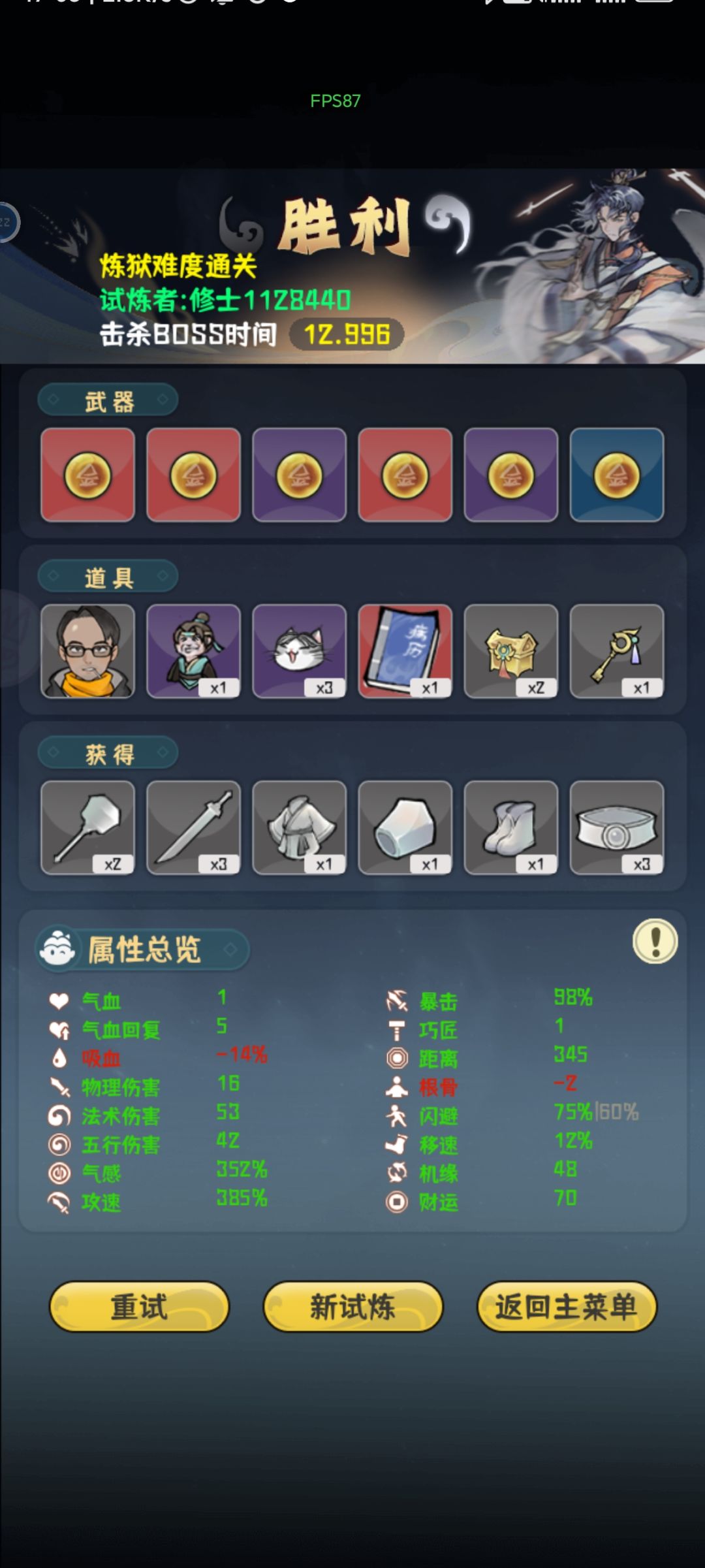 难点在14,15关卡小怪扎堆满屏子弹 前期可以拿邪修武器刷攻速,伤害(角色很适合邪修) 移速很关键多拿加移速,血量的道具 闪避60拿满 遇到减根骨道具不用看直接拿, 前期可以拿火剑打击退持续燃烧伤害拿源石,适当拿五行伤害来增加燃烧伤害,(这个角色主要是躲避跑跑跑) boss战围绕boss顺时针走位跟着boss子弹走, 躲避boss子弹伤害(boss子弹伤害非常疼)击退武器来规避小怪 (总结这角