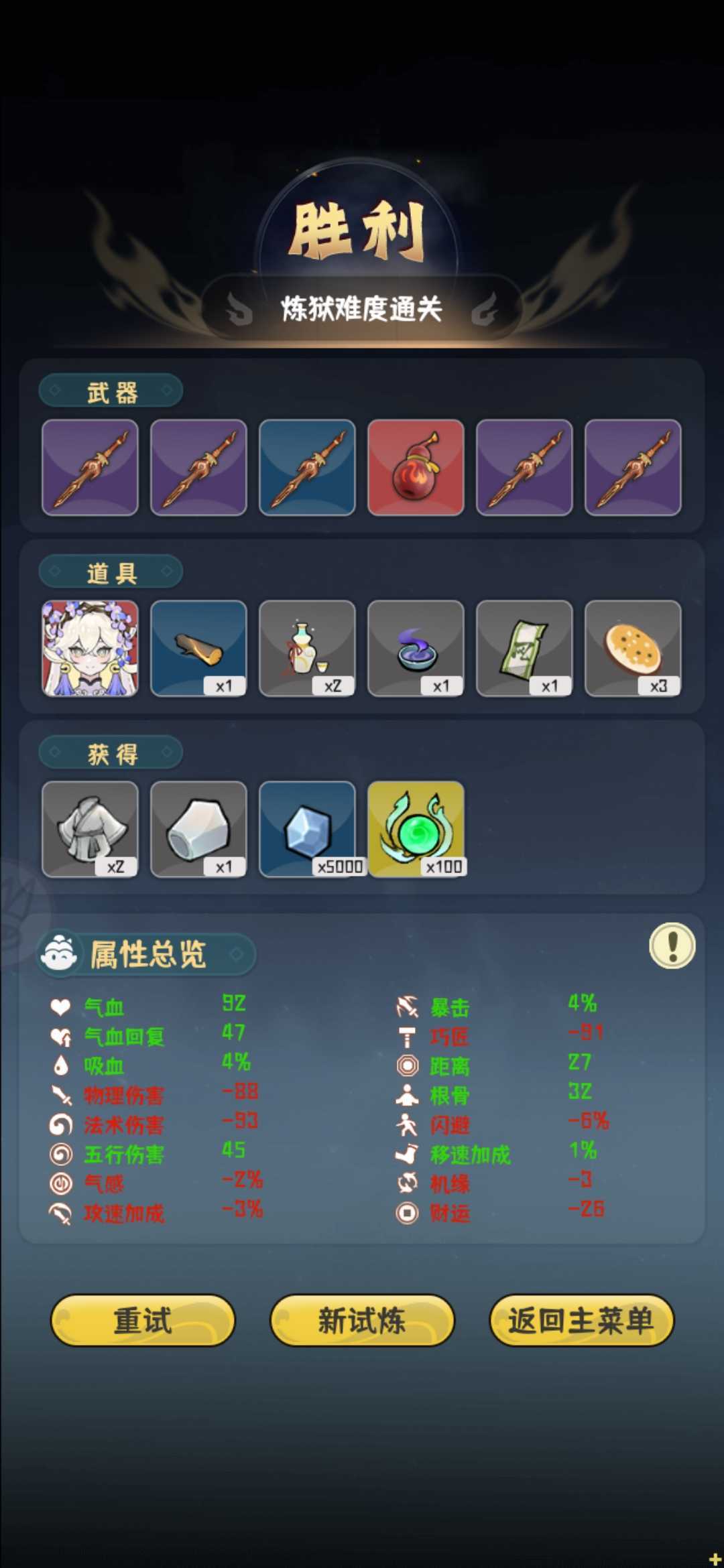 死了直接退出再进,可以继续打,觉得没希望就重开吧[表情_斜眼笑] 炼狱的怪很猛,稍有不慎就挂了,看的之前的帖子那些离谱的属性个人感觉就搞不出来[表情_生气],毕竟前期不堆肉都没后面了,或者前期堆了机缘或者财运不能拿到要的也是无了。 看上面属性其实很一般,苟活而已。后期已经拿不到什么钱了,运气不错刷出来的东西都买不起,不过过关够了。 第一:最重要的是移速,30%以上吧,绕边跑,被boss追上基本完了