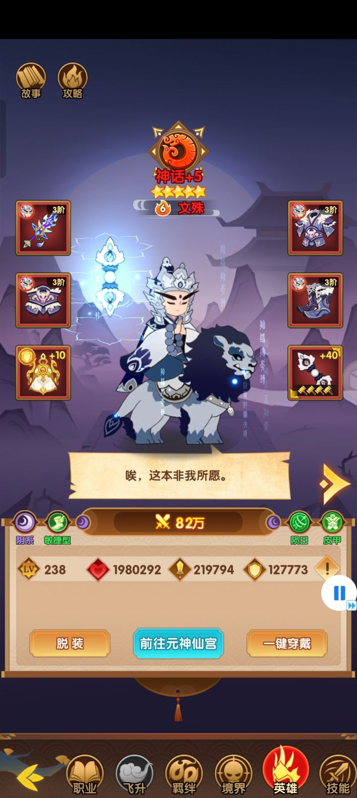 东皇钟很厉害,主要是能抗很多伤害。属性都堆免伤,文殊不死就能有伤害。抗得轻松的关卡还是上伏羲琴,打得快大招快。