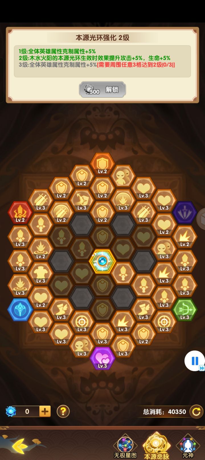 图1:光环强化需要的最低点图2:1级,当然如果没有这么多点,可以优先点辅助,C位输出,肉等三个位,其他可以先不点。也可以不像我这样点,本源光环位置向外直扩,本源三列直扩的可以每组省50点,点比较吃紧,可以这样。图3:2级,还是一样,可以优先点辅助,c位输出肉盾到2级,其他可以不点,也可以以后点。图4:每组本源周边三格点到2。图5:每组本源周边三格附近两格点到2。图6:每组3级。图7:多