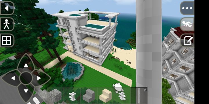 最初我住在一棵高耸入云的云杉树冠上,可是高度给我带来了获取食物和交通的不便利,于是我决定搬迁。现在想起来,我的一套旧衣服被留在了那里。 在新的居住点,我用沙岩盖了庇护所,用木板铺庇护所的地板,再把4个箱子嵌到地板里。为了能看到附近的情况,我修了木栅栏保护的前院,并在庇护所外面放梯子。每天早晨我都会从门出去,然后从前院的木梯子爬上屋顶。我还修了一侧的钉板沟。每天早晨我从庇护所的另一侧走梯子下去,去