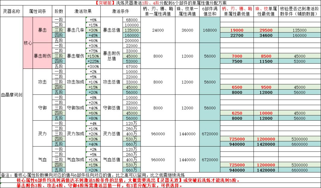 目前金色部件4个属性词条,红色部件5个属性词条。 每个灵器洗炼界面点击“❓”可查看词条上限值,前4个部件的词条上限值一致,后2个部件词条上限值一致。 我整理这个表,只是想知道某个词条要洗到3档,我洗到多少值该锁,因为锁低值费石头。 我要是想洗到4档,我应该洗到多少值能使总值激活4档。 中规中矩的洗法,先洗3阶过渡用,突破后洗5阶。 听说的洗【灵器无双】方法: 血晶摩诃剑举例 暴击(红色值) 暴击