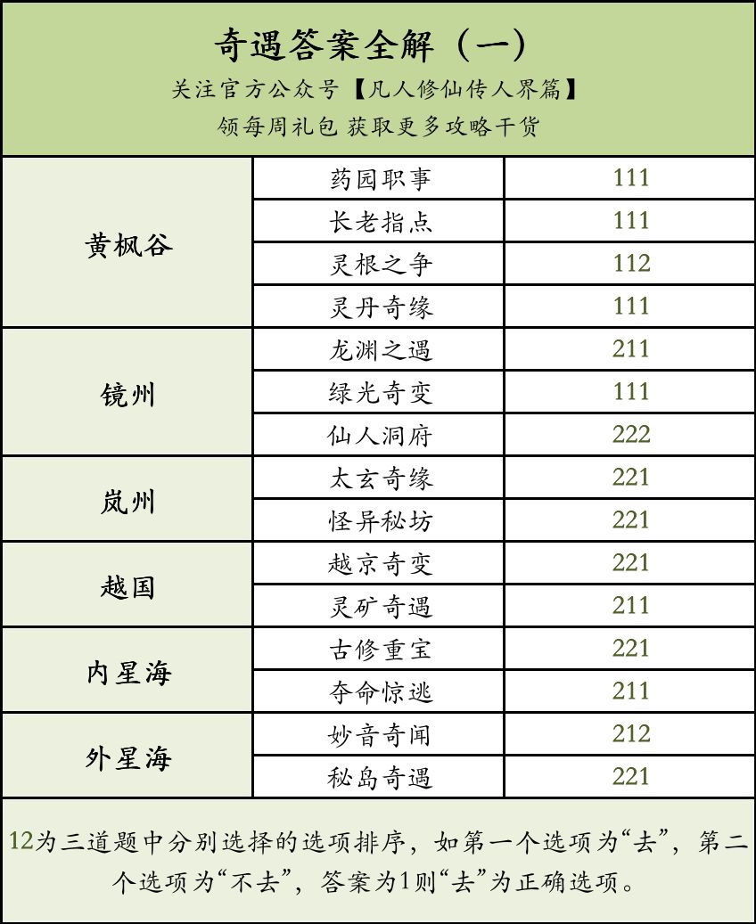 自公测以来,道友们就催爆了小银月! 催什么?那当然是事关天资丹、极品法宝、极品草药等奖励的奇遇玩法划重点啦! 应道友之邀,奇遇重点来啦||ヽ(* ̄▽ ̄*)ノミ|Ю 举例: ✦黄枫谷✦ 药园职事 选择:谨慎询问情况(第一个选项) 选择:不动声色小露一手(第一个选项) 选择:坦然接受(第一个选项) 则答案为上表中的 111。 道友们都掌握秘诀了吗?下一期奇遇重点见!