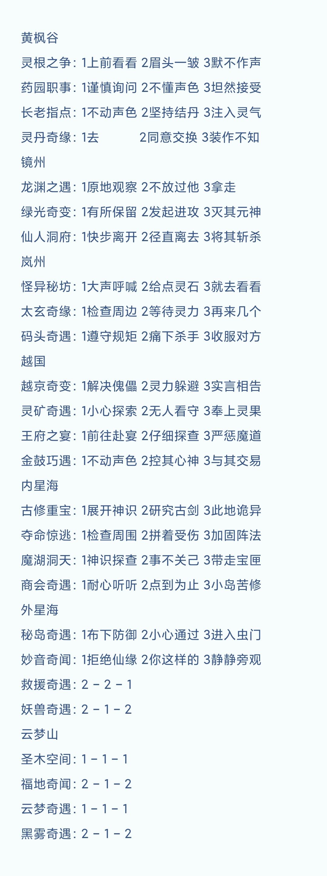 参与游历可触发奇遇跟仙缘 灵根之争:1上前看看2眉头一皱3默不作声 药园职事:1谨慎询问2小露一手3坦然接受 长老指点:1不动声色2坚持结丹3坚持注入 灵丹奇缘:1去2同意交换3假装不知 仙人洞府:1快步离开2径直离去3将其斩杀 绿光奇变:1有多保留2发起进攻3灭其元神 龙渊之遇:1原地观察2不放过他3拿走 太玄奇缘:1检查周边2等待灵力3再来几个 怪异秘坊:1大声呼喊2给点灵石3就去看看 越京奇