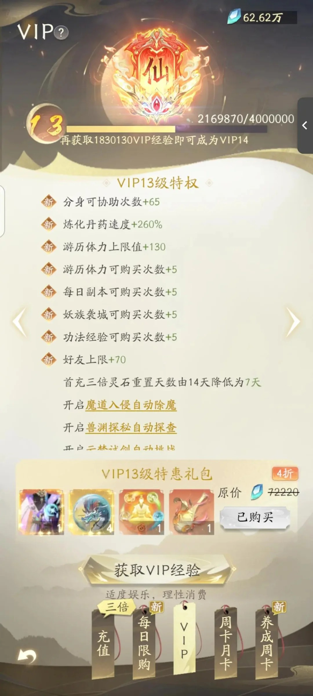 2023年5月24开服,凡人历2023道年 2024年10月11大乘后10,凡人历2529道年 2528-2022=507天 想要渡劫解锁“剑开天门”要做完“至尊百族”任务,连续做3天主线任务,另外还有“送仙使680朵瑶池玉莲(友好度达6800的任务)”,我问家族已经剑开天门的人的意见,他们说等花会活动一起送期待