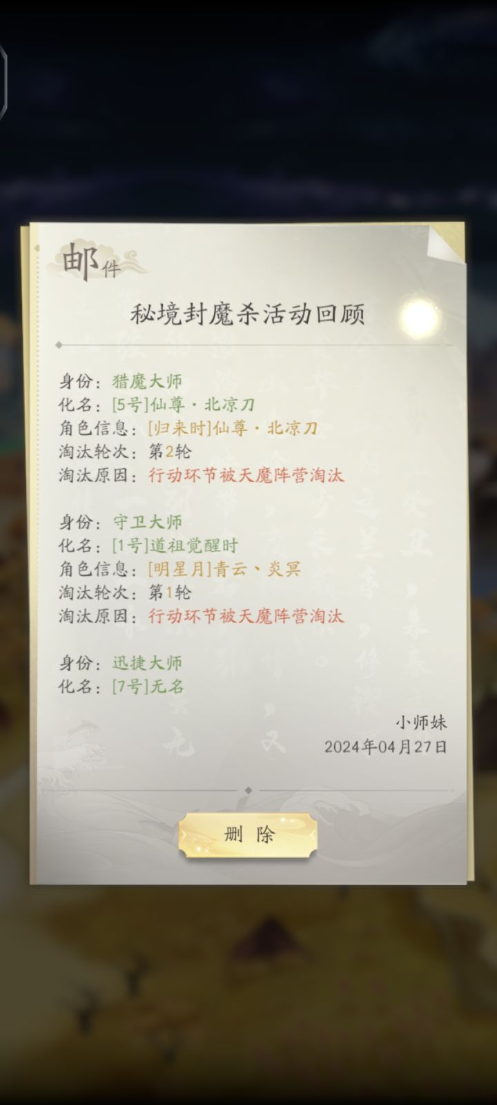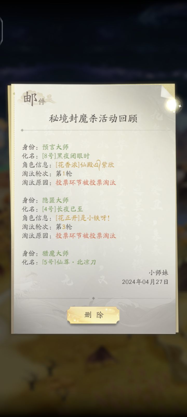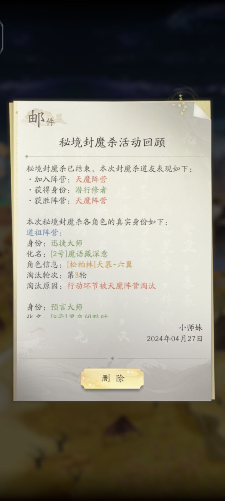 一开始天魔行动,我和另一个魔决定把1号打了,不说话还叫个这个名,觉得他可能大概率是预言师!接下来就太搞笑了,第一轮全员投票预言师全票当选最佳MPV,被道祖们一致踢出道祖阵营!我估计当时预言师内心是炸裂的 有话不能说 说了被天魔打 不说被道祖开除……!第二轮开始道祖们又是喊预言师验我们3号魔又是喊守卫保护 我和3号魔瑟瑟发抖!天魔行动开始我建议把5号干掉而不是干掉喊打掉3号最凶的7号,谁让他话